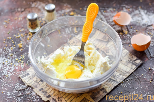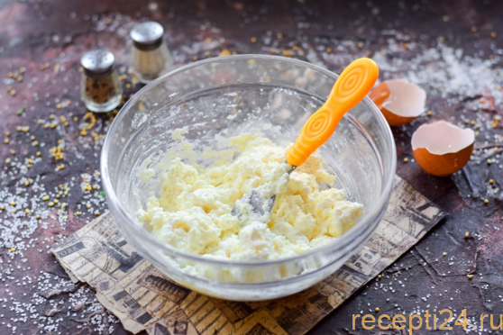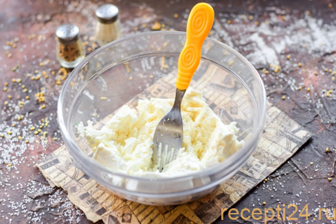 Далее выложенный в миску творог тщательно размять вилкой. Чаще всего используют творог в брикетах. Если же у вас он зернистый, то его нужно перебить погружным блендером.
