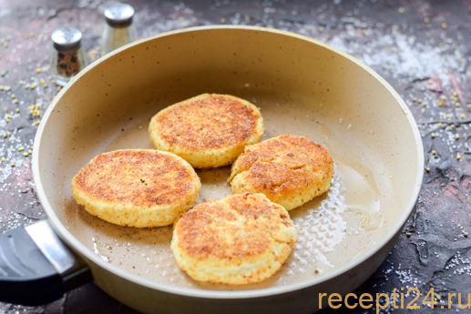 Затем на разогретую сковороду с антипригарным наполнителем выкладываем получившиеся кусочки. Ее можно слегка смазать маслом при желании, но лучше обойтись без него, потому что оно добавляет лишние калории в блюдо. Первые 5 минут следует обжаривать сырники без крышки, периодически переворачивая.