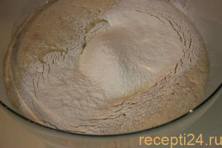 В опару просеять еще 3 стакана муки, добавить 200 мл воды комнатной температуры, 50 мл подсолнечного масла и щепотку соли. Вымешать тесто до однородной массы и на 20-40 минут поставить в тепло.