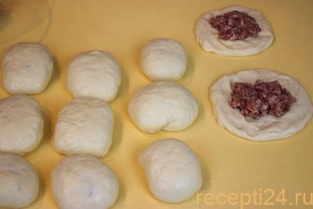 Получившиеся шарики аккуратно распластать в несильно тонкие лепешки. По центру на каждый выложить примерно 1 ст.л. фарша, сформировать мешочек и герметично защепить его пальцами сверху.
