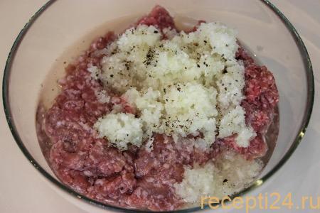 200 г говядины и 100 г свинины перекрутить в мелкий фарш. Добавить 1 мелко нарезанную головку лука, 100 мл холодной воды, соль, перец по вкусу. Хорошо вымешать полученную массу.