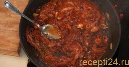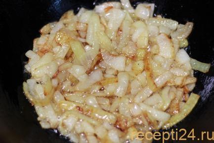 К смальцу выкладывается нарезанный кольцами лук, и все хорошенько прожаривается.
