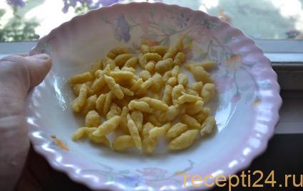 Если муки оказалось недостаточно, подсыпается еще столько, сколько потребуется. Из теста делаются тоненькие в 1 см колбаски. От них отщипываются небольшие кусочки. Так готовятся чипетки. Когда-то они заменяли пастухам макаронные изделия, но так и остались частью блюда. Чипетки отвариваются отдельно в кастрюле. Для этого их необходимо закинуть в слегка подсоленную кипящую воду и помешать. Как только все закипит, и изделия всплывут, их держат 1 мин. на плите и выключают. Чипетки вытаскиваются из кастрюли в отдельную емкость. Раскладывать их нужно на тарелке по отдельности друг от друга, чтобы они не слиплись. -