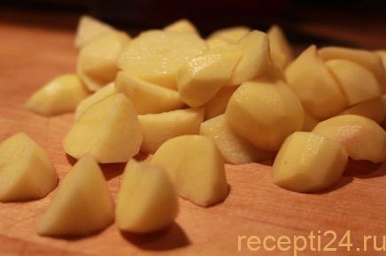 Картошка чистится, режется кубиками (достаточно крупными), а остальные овощи нарезаются соломкой (кроме томатов).