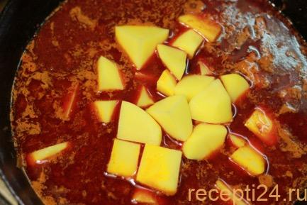 В гуляш добавляется картофель и морковь. Как только он станет не таким твердым, туда добавляется сладкий перец.