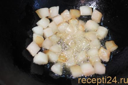 Свиное сало нарезается небольшими кубиками и обжаривается до золотистого цвета на сковороде. Шкварки вытаскиваются и убираются в сторону, они не будут использоваться в рецепте. Применяется только топленый смалец.