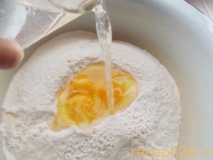 Мука просеивается через сито в объемную миску. В мучной горке делается углубление (по ее центру). Туда выливается вода, растительное масло, добавляется половина чайной ложки соли и разбиваются яйца.