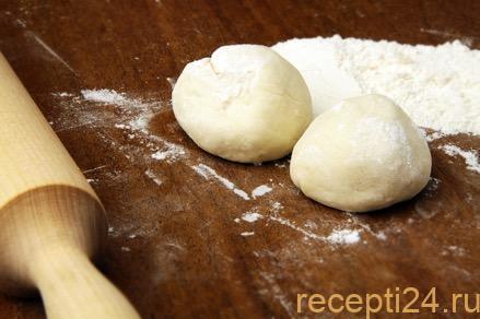 Из продуктов замешивается тугое тесто. Его можно использовать сразу, но лучше оставить под пищевой пленкой на 15-20 мин., и за это время заняться подготовкой начинки.
