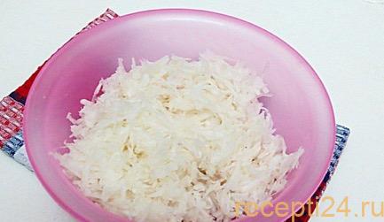 Из заранее подготовленной редьки сцеживается лишняя жидкость. Можно немного отжать руками, чтобы начинка не получилась слишком сочной. В противном случае тесто быстро размокнет, несмотря на яйца в его составе.
