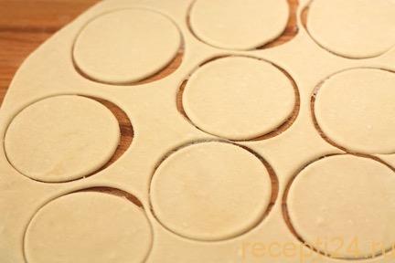 Тесто раскатывается на доске. Из него вырезаются небольшие кружки. Делать это можно при помощи небольшой рюмки.