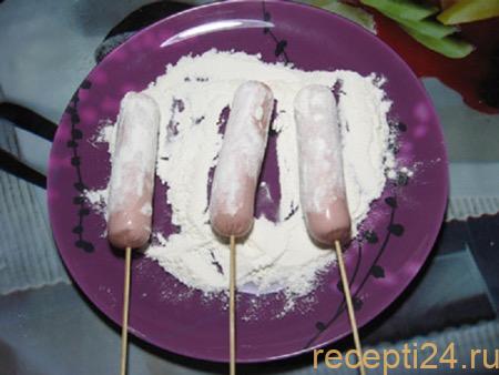 Нанизать сосиски на шпажки и обвалять их в муке. Это ювелирная работа. Если муки на поверхности будет слишком много – кляр будет отваливаться вместе с ней. Если слишком мало – не будет схватываться, соскальзывая в процессе обмакивания. Мука должна тонким слоем, но полностью, покрывать всю поверхность сосиски.