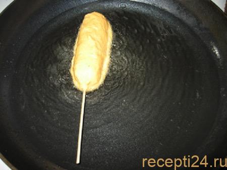 Вместо сковороды можно использоваться толстостенную узкую кастрюлю. Это будет намного удобнее. Так сосиски можно будет опускать палочками вниз и за них же потом вытаскивать готовые корн-доги из кипящего масла.