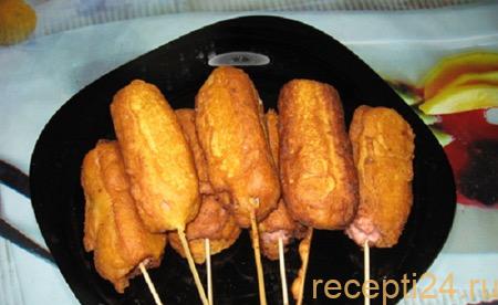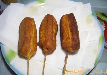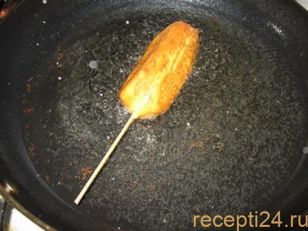 Несмотря на то, что обмакивать в кляр и обжаривать сосиски на сковороде на шпажках не очень удобно, лучше все же вставлять их в самом начале. Тогда в процессе жарки, тесто прилипает к такой ножке и корн-дог лучше на ней держится. Если вставлять палочки в уже готовые сосиски, есть риск, что последние будут просто соскальзывать с них.