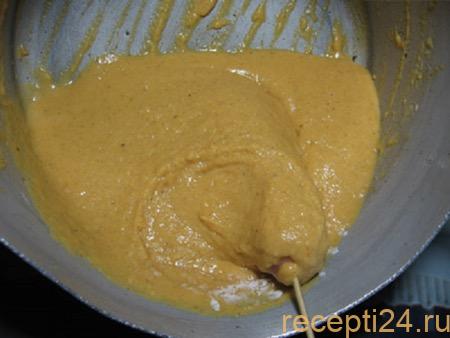 Чтобы было удобно обмакивать в кляр, можно перелить его в максимально узкий высокий сосуд. Если такого нет – просто наклонить емкость с кляром, чтобы добиться удобной глубины. Сосиску на шпажке погрузить в массу и постараться слегка ее прокрутить. Поднять и даться стечь лишнему.