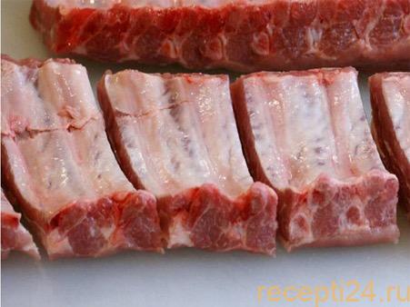 Хорошо вымыть мясо. Если ребра сильно большие, нарезать порционно.