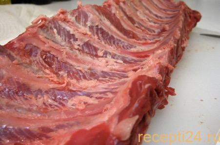 После тщательной промывки ребрышек обязательно нужно срезать пленку на обратной стороне. Готовое блюдо может получится с неприятным привкусом. Эта часть мяса очень жесткая. Даже при высоких температурах волокна пленки не размягчаются.