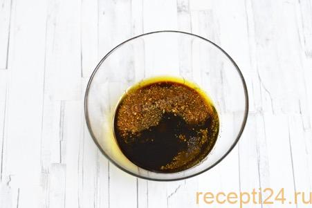 Смешать 5 ст.л. соевого соуса, 6 ложек растительного масла, 2 ст.л. лимонного сока, 2 ст.л. дижонской горчицы, паприку, 2 ст.л. хмели сунели, соль и молотый перец.