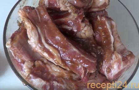 Положить мясо в емкость с маринадом. Тщательно втереть специи в ребрышки. Оставить мариноваться на ночь.