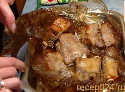 На противень выложить ребрышки в рукаве. Хорошо закрыть на завязки. Запекать в духовке при температуре 180 градусов 1.5 часа.