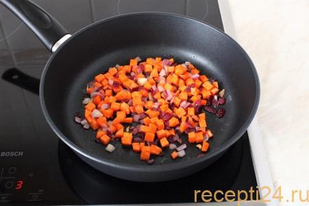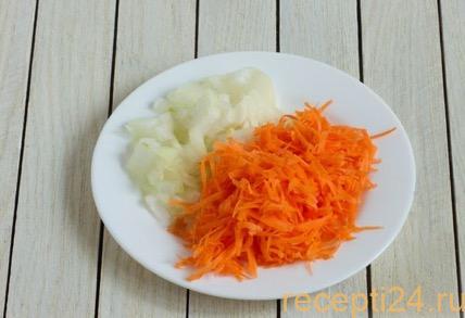 К луку надо добавить морковь. Овощи тщательно перемешивают, обжаривают в течение 3 минут.