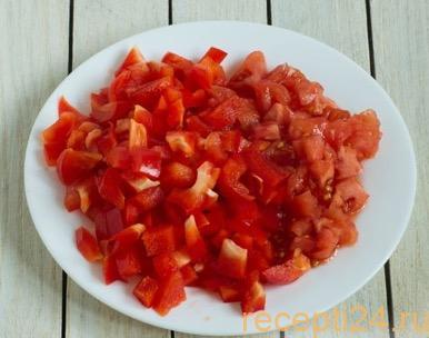 Перец надо тщательно очистить от семян и нарезать кубиками или же полосками. Помидор тщательно моют и нарезают таким не способом.