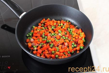 Затем добавляют перец и горошек. Смесь обжаривают 3 минуты на среднем огне.После этого, нужно добавить кукурузу, приправы. На этом же этапе добавляют чеснок.