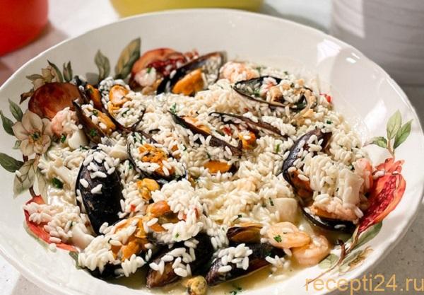 Приготовление ризотто по подобному рецепту в Италии встречается также с грибами и кальмарами, вместо морепродуктов. Отличная альтернатива предложенному варианту.