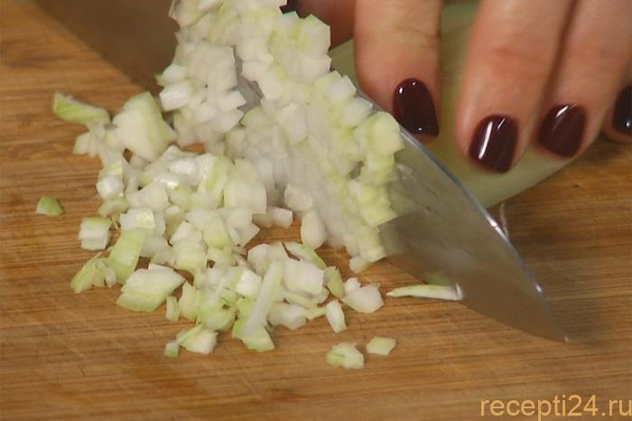 На хорошо разогретой сковороде растопить 110 г сливочного масла. Млеко нарезать 0,5 головки лука шалот. Размер каждого кусочка должен примерно таким, как размер рисового зерна.