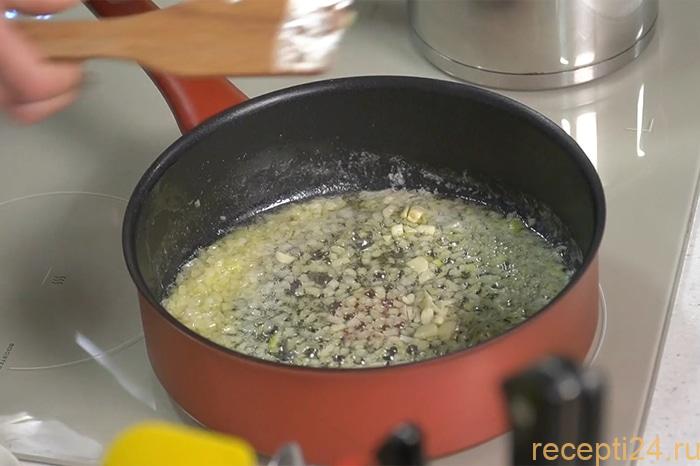 Уменьшить огонь, и высыпать лук на сковороду с растопленным сливочным маслом. Небольшими кусочками нарубить 1 зубчик чеснока. Добавить к луку. Постоянно помешивая, обжаривать овощи примерно 3 мин.