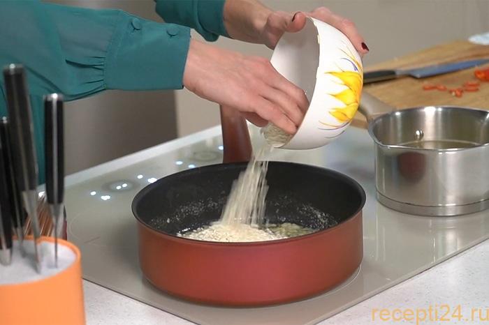 Хорошо промыть под проточной водой рис для приготовления ризотто. Высыпать его в сковороду к пассированному луку с чесноком. Подогревать рис на среднем огне примерно 3 минут, постоянно помешивая.