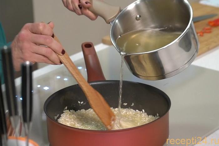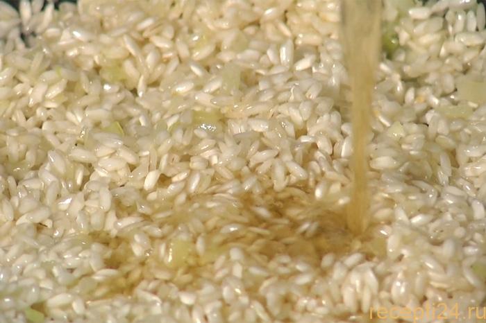 Когда зерна начнут приобретать прозрачность, добавить 150 мл белого вина, перемешать и оставить выпариваться 2-3 минуты.