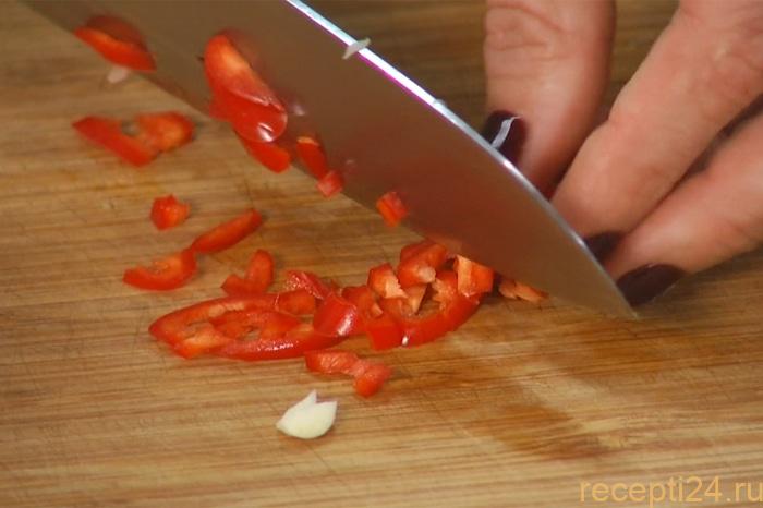 Мелко нарубить 1/3 перца чили и отправить его в сковороду.