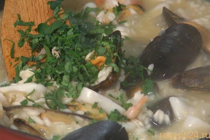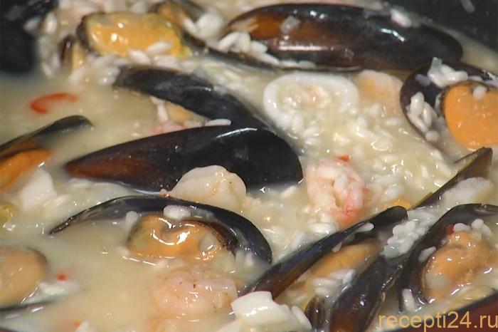 Добавить к рису 300 г креветок и 300 г мидий в панцирях. Перемешать и варить еще 16—18 мин, постепенно доливая в сковороду оставшиеся 0,5 л рыбного бульона.