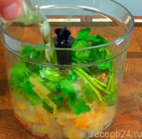 Влить 30 г виноградного уксуса и произвольными частями нарвать 20 г петрушки.