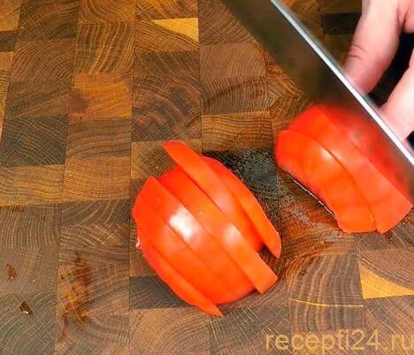 100 г помидоров разрезать на колечки по 1,5-2 см, оставшиеся 100 г — на полукольца такой же толщины.