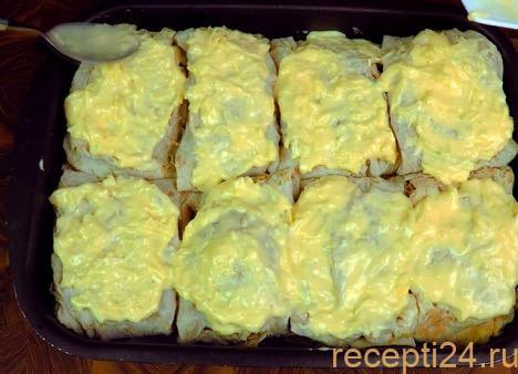 При выкладывании соуса на рыбные подушки перед затеканием нужно стараться, чтобы он не стек вниз и не касался бортиков. Сырная масса может начать гореть — блюдо напитается неприятным запахом.
