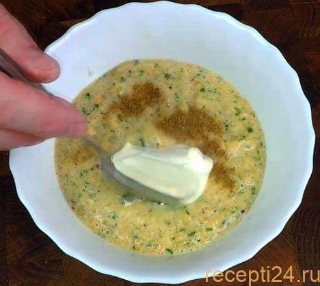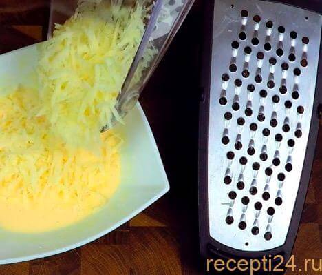 На крупной терке к яйцу со сметаной натереть 60 г твердого сыра и перемешать.