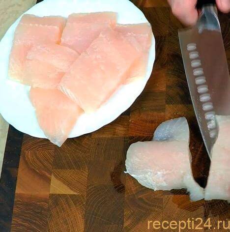 700 г филе рыбы разрезать поперек на кусочки примерно по 4-5 см. Положить в емкость с соусом на 10-15 мин. Чтобы кусочки филе лучше промариновалось, смесь должна покрывать его полностью.