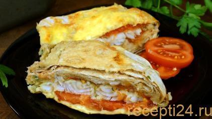 2 армянских лаваша разрезать на 8 длинных полос. На каждую полосу выложить 1 кольцо помидора, на него — кусочек рыбы в соусе, сверху еще 0,5 ст.л. соуса и 1 полукольцо помидора. Закрыть конвертом.