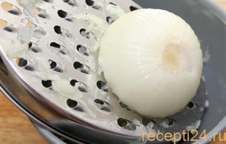Луковицу натираем на крупной терке (можно мелко порезать ножом) и обжариваем на 30 г подсолнечного масла до золотистого цвета.