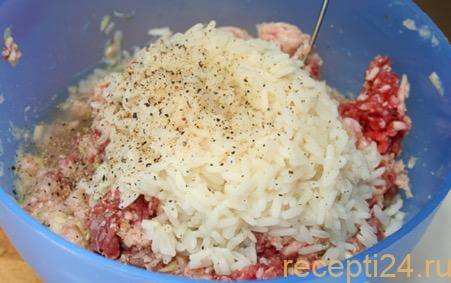 В глубокую миску добавляем 300 грамм отварного риса, 600 грамм свино-говяжьего фарша, жареный лук, 1 чайную ложку соли и 0,5 чайной ложки черного молотого перца. Все хорошенько вымешиваем до получения однородной массы.