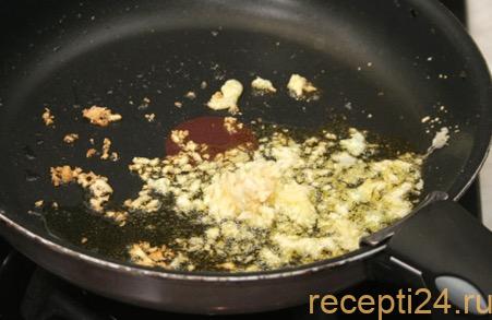 Измельчаем 10 г (2-3 зубчика) чеснока, обжариваем на 25 г сливочного масла 1 минуту.