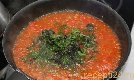 Добавляем протертые помидоры, 500 воды, 0,5 чайной ложки соли, измельченную зелень. Тушим все в сковороде 5 минут.