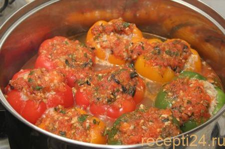 По такому рецепту можно смело готовить перец не только на плите, но и в мультиварке. Некоторые хозяйки предпочитают использовать гусятницу или тушить фаршированный перец в духовке. Если вы используете замороженные перцы, не нужно их предварительно размораживать, первые 15 минут тушите не в холодной воде, а сразу в кипятке. В целом, по времени процесс варки свежей продукции или полуфабрикатов занимает 45 минут.
