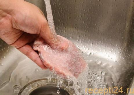 Хорошенько промойте кусочки под проточной водой. Если вы используете замороженную индейку, предварительно её нужно разморозить. Нужно помнить, что размораживание в микроволновке или в горячей воде сделает мясо жёстким, оно приобретёт волокнистую структуру.