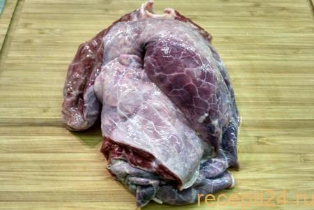 Говяжье легкое необходимо хорошо вымыть под проточной холодной водой. Разрезаем мякоть острым ножом вдоль, извлекаем из нее все жилы, пленки, сосуды.