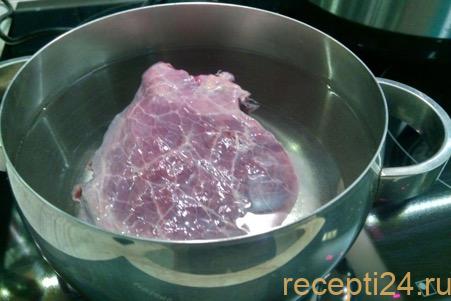 Отрезаем от общей массы кусок весом 500 г и опускаем его в кастрюлю подходящих размеров. Заливаем водой, чтобы полностью она покрыла содержимое.