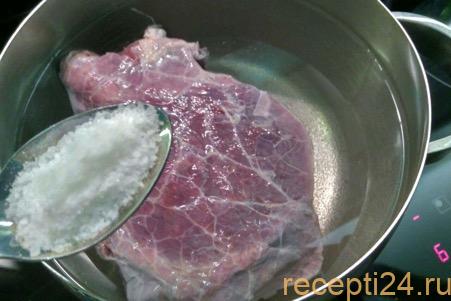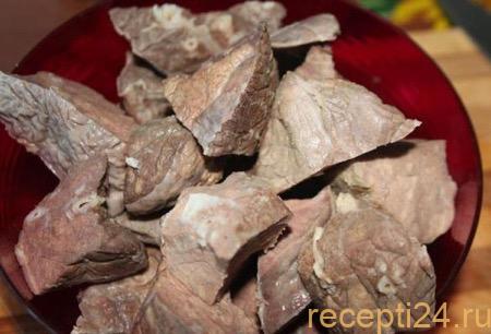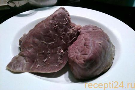 Перед приготовлением кусок мякоти нужно подготовить. Нужно тщательно его промыть (можно прямо под краном). Далее заливаем все холодной водой и оставляем вымачиваться на несколько часов. Воду лучше периодически менять. Это позволит избавиться от вредных веществ, которые не нужны нам в пище, такая процедура сделает субпродукт более мягким.