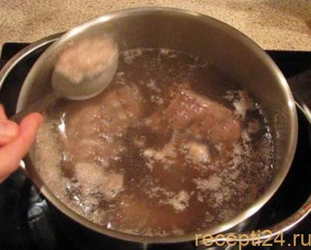 При кипении сверху будет образовываться пена, её придется убирать ложкой, либо же специальным приспособлением с дырочками. В среднем варить до готовности необходимо 1,5 часа.