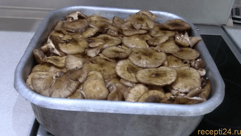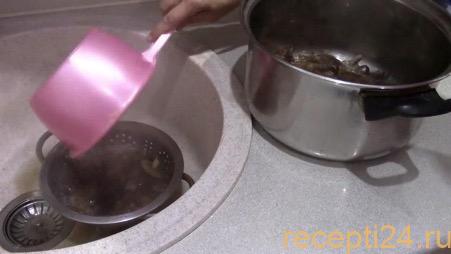 По прошествии указанного времени отбрасываем опята порциями на дуршлаг, даем стечь грязной жидкости, тщательно ополаскиваем под проточной водой.